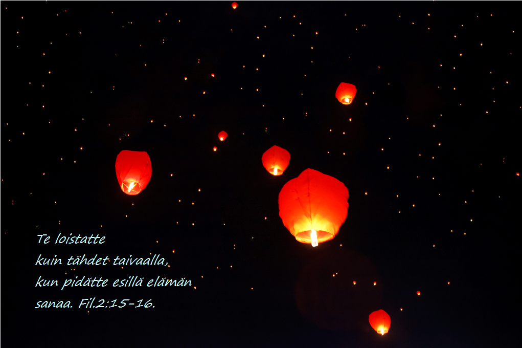 Jumala saa teissä aikaan sen, että tahdotte tehdä ja myös teette niin kuin on hänen hyvä tarkoituksensa. Tehkää kaikki nurisematta ja empimättä, jotta olisitte moitteettomia ja puhtaita, nuhteettomia Jumalan lapsia tämän kieroutuneen ja turmeltuneen sukukunnan keskellä. Te loistatte siinä kuin tähdet taivaalla, kun pidätte esillä elämän sanaa, ja minä voin Kristuksen tulemisen päivänä ylpeillä siitä, että en ole turhan vuoksi ponnistellut ja nähnyt vaivaa. Fil.2:13-16.