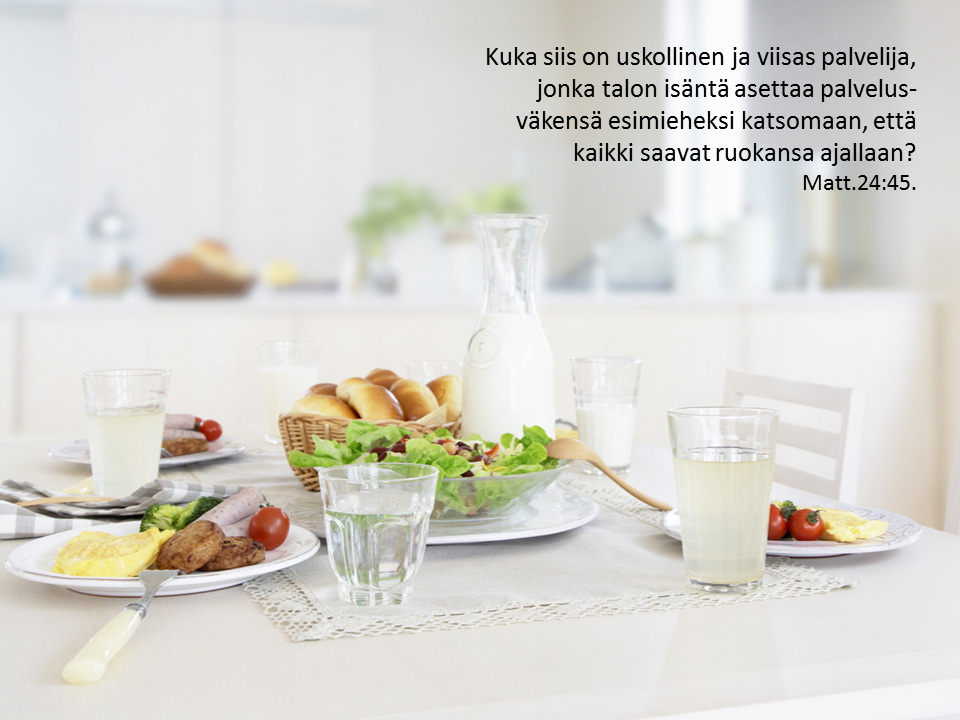Oletko koskaan käynyt mustikassa ja syönyt mustikkapiirakkaa, jonka leipomisessa on käytetty sinun keräämiäsi marjoja? Eihän ole mitään parempaa? Mutta jos aina vain syöt samaa tarjolle pantua pöperöä, eilisen lämmitettyjä tähteitä, olkoot ne vaikka minunkaltaiseni puskapapin tarjoilemaa ”pyttipannua”, ennen pitkää alat kyllästyä ja haluta tuoretta ruokaa. Sen kaipuun ja halun on Jumalan henki pannut sisimpääsi. Etsi siis ruokasi itse – etsivä löytää. Samalla Pyhä Henki voi antaa sinulle juuri sitä, mitä eniten tarvitset – niitä ravintoaineita, niitä vitamiineja, niitä hivenaineita, joita sinulta puuttuu. Monipuolinen ruoka on ravitsevaa aina – myös Jumalan pöydässä.