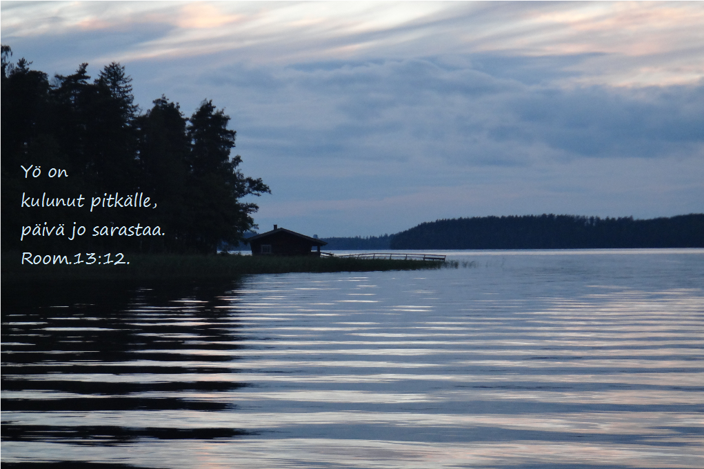Yö on kulunut pitkälle, päivä jo sarastaa. Hylätkäämme siis pimeyden teot ja varustautukaamme valon asein. Room.13:12.