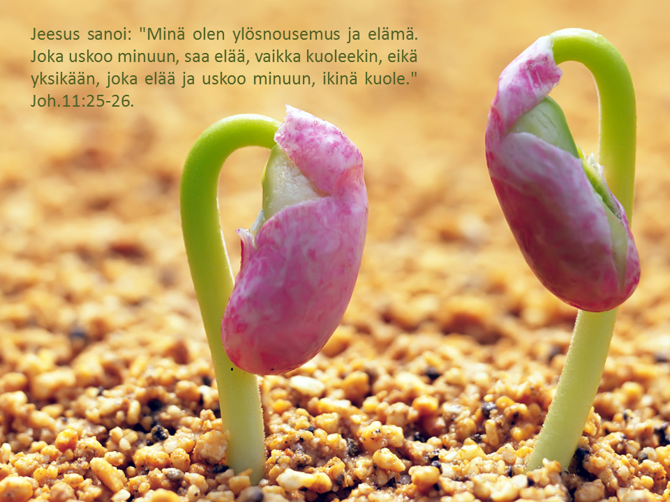 Jeesus sanoi: ”Minä olen ylösnousemus ja elämä. Joka uskoo minuun, saa elää, vaikka kuoleekin, eikä yksikään, joka elää ja uskoo minuun, ikinä kuole.” Joh.11:25-26.
