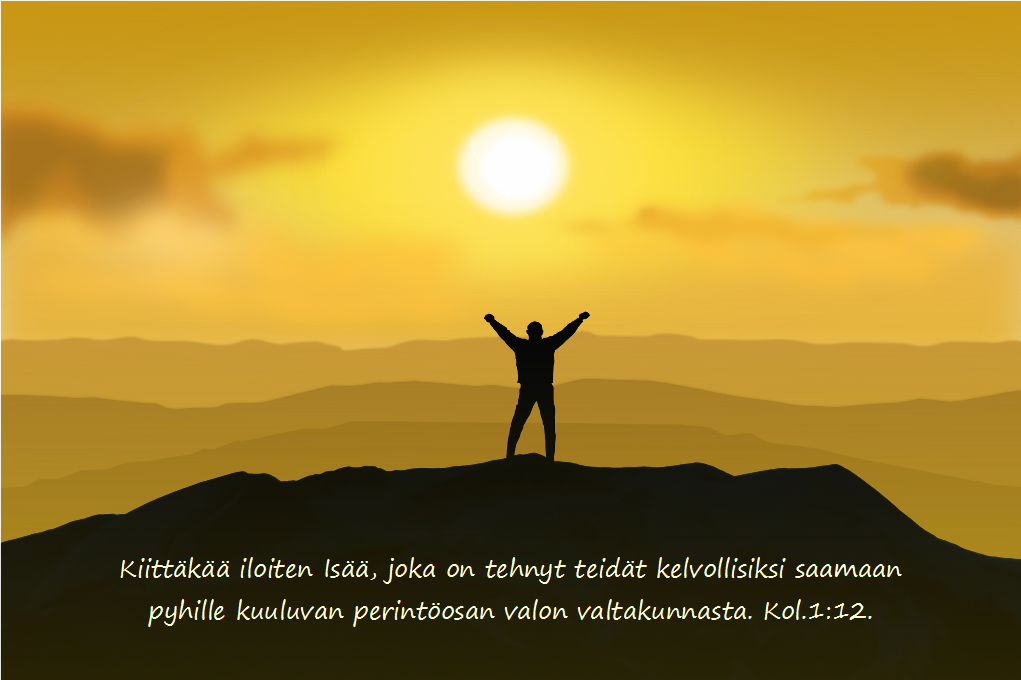 Tulkaa hänen porteilleen kiittäen, hänen esipihoilleen ylistystä laulaen. Kiittäkää häntä, ylistäkää hänen nimeään (Ps.100:4). Kiittäkää kaikesta. Tätä Jumala tahtoo teiltä, Kristuksen Jeesuksen omilta (1.Tess.5:18).
