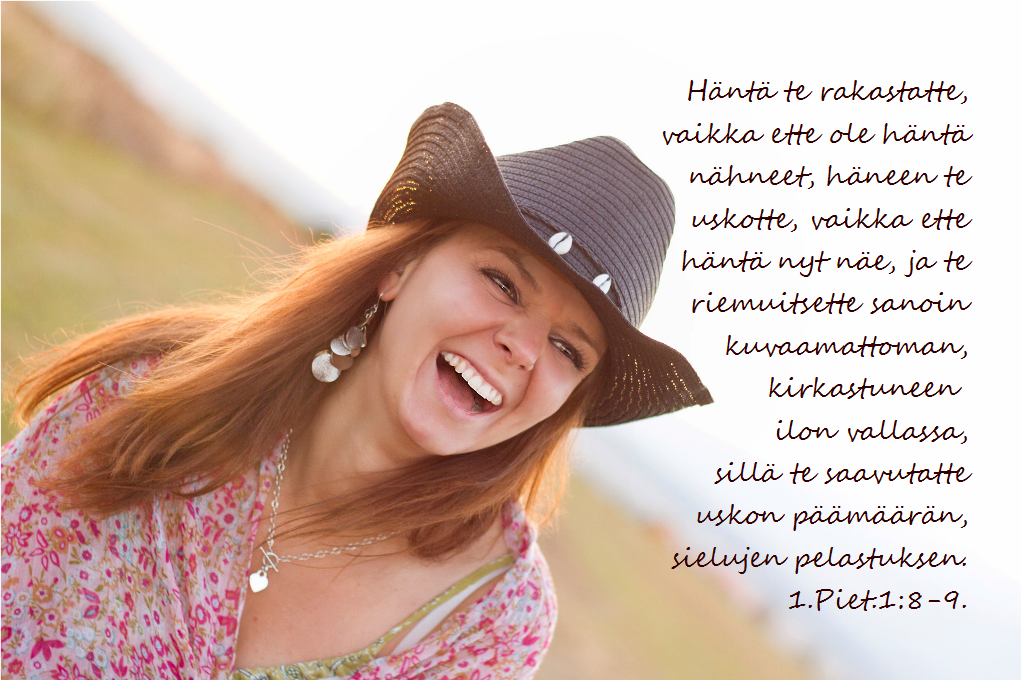 Häntä te rakastatte, vaikka ette ole häntä nähneet, häneen te uskotte, vaikka ette häntä nyt näe, ja te riemuitsette sanoin kuvaamattoman, kirkastuneen ilon vallassa, sillä te saavutatte uskon päämäärän, sielujen pelastuksen. 1.Piet.1:8-9.