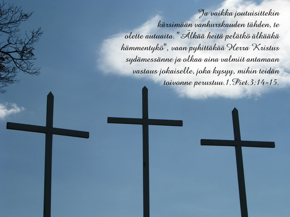 kolmeristiaMinä asun korkeudessa ja pyhyydessä, mutta asun myös murtuneiden ja nöyrien luona. Minä virvoitan murtuneiden hengen ja herätän eloon nöyrien sydämen. Jes.57:15.