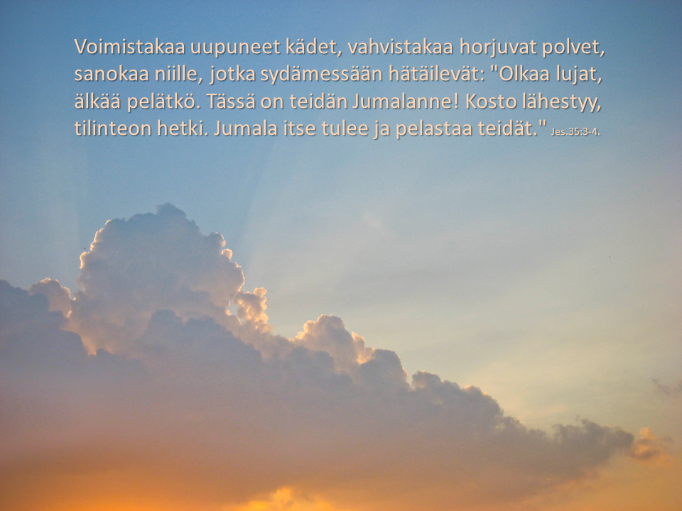 Voimistakaa uupuneet kädet, vahvistakaa horjuvat polvet, sanokaa niille, jotka sydämessään hätäilevät: ”Olkaa lujat, älkää pelätkö. Tässä on teidän Jumalanne! Kosto lähestyy, tilinteon hetki. Jumala itse tulee ja pelastaa teidät.” Jes.35:3-4.