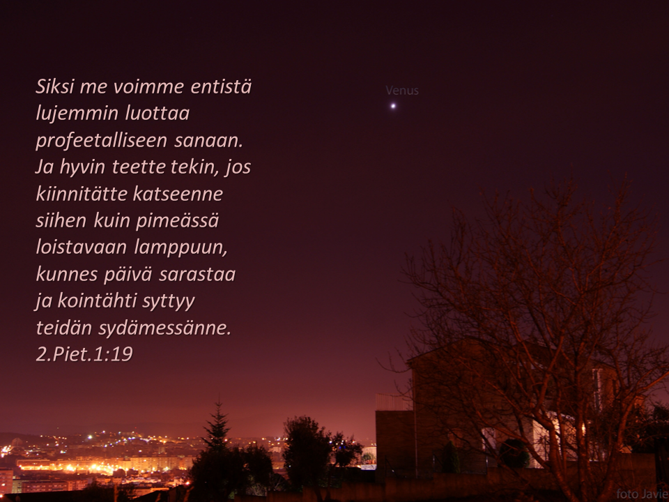 Siksi me voimme entistä lujemmin luottaa profeetalliseen sanaan. Ja hyvin teette tekin, jos kiinnitätte katseenne siihen kuin pimeässä loistavaan lamppuun, kunnes päivä sarastaa ja kointähti syttyy teidän sydämessänne. 2.Piet.1:19.