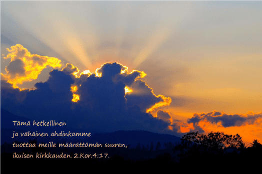 Iloitkaa päinvastoin sitä enemmän, mitä enemmän pääsette osallisiksi Kristuksen kärsimyksistä, jotta saisitte iloita ja riemuita myös silloin, kun hänen kirkkautensa ilmestyy. 1.Piet.4:13.