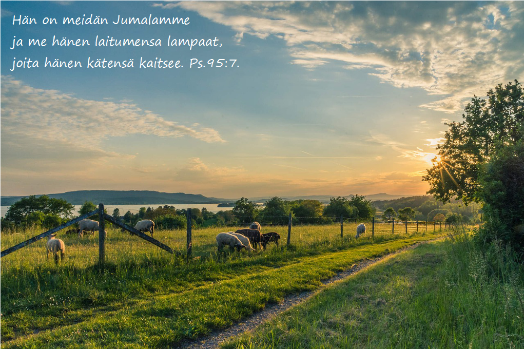 lammaslaidunHyvä Paimen antaa henkensä lampaiden puolesta (Joh.10:11). Jumalan lupauksen perusteella hän ei pakene, kun vaara uhkaa, vaan puolustaa lampaita henkensä uhalla. Ollakseen lupauksensa mukaan Hyvä paimen, Jeesus suostui kärsimään ristin kuoleman.