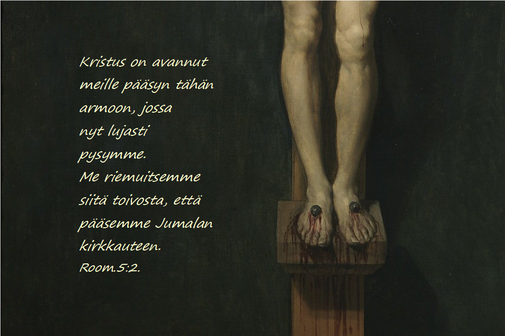 Nostakaamme siis katseemme häneen, joka ristillä antoi henkensä meidän puolestamme. Usein viime aikoina olen viljellyt määrättyä mielikuvaa Jeesuksesta ja kokenut olevani hänen ristinsä juurella. Otan ristin takaa Jeesuksen veriset jalat syliini. Kiedon kädet hänen ympärilleen. Siinä on hyvä olla.