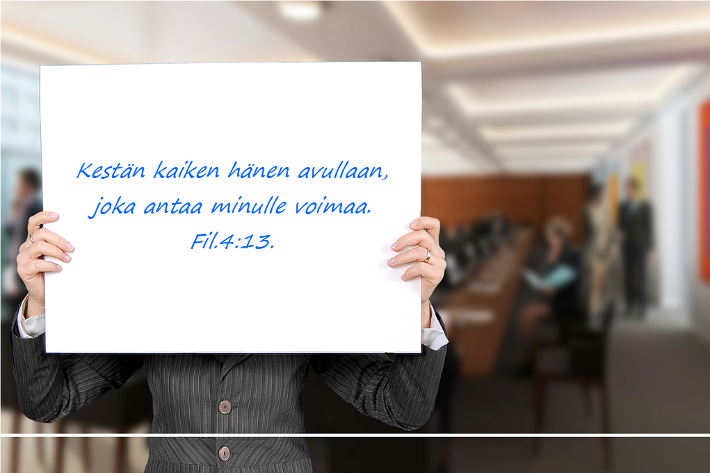 Pysy rukouksessa ja tee työsi rukouksen hengessä – Herran käsi tukee sinua. Sinä saat ikeen, joka sopii, ei hierrä, ei paina eikä tunnu raskaalta. Sinun voimasi elpyvät, sinun elämänlaatusi kohenee, sinun elämänhalusi syvenee ja ilosi palaa. Sinä saat loistaa ja sinun myönteinen asenteesi tarttuu toisiinkin.