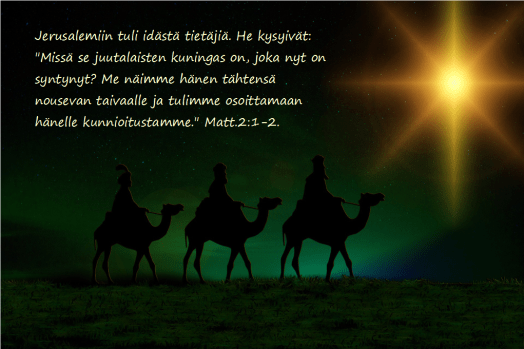 Yhtäkkiä heidän edessään seisoi Herran enkeli, ja Herran kirkkaus ympäröi heidät. Pelko valtasi paimenet, mutta enkeli sanoi heille: ”Älkää pelätkö! Minä ilmoitan teille ilosanoman, suuren ilon koko kansalle. Tänään on teille Daavidin kaupungissa syntynyt Vapahtaja. Hän on Kristus, Herra.” Luuk.2:9-11.