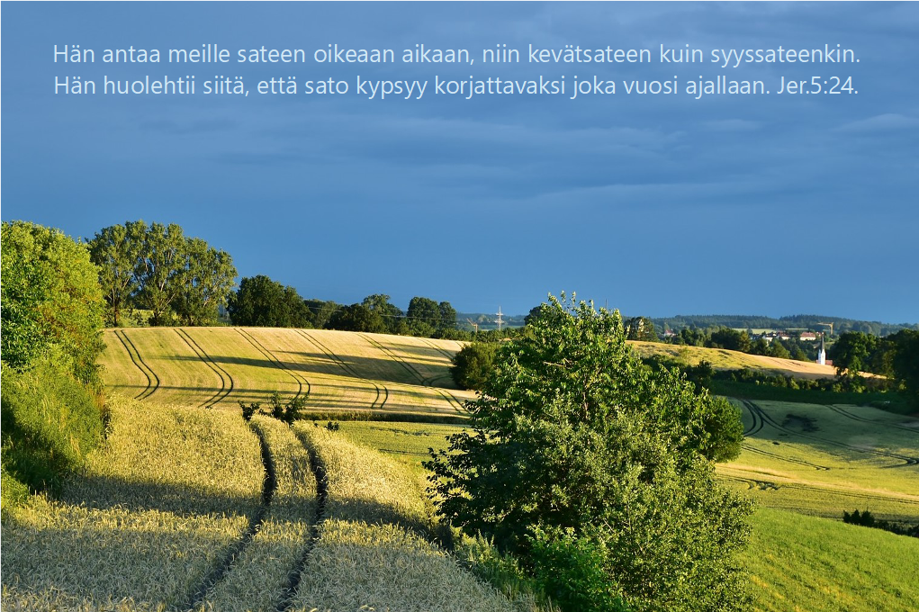 Jotka kyynelin kylvävät, ne riemuiten korjaavat. Jotka itkien menevät kylvämään vakkaansa kantaen, ne riemuiten palaavat kotiin lyhteet sylissään. Ps.126:5-6.