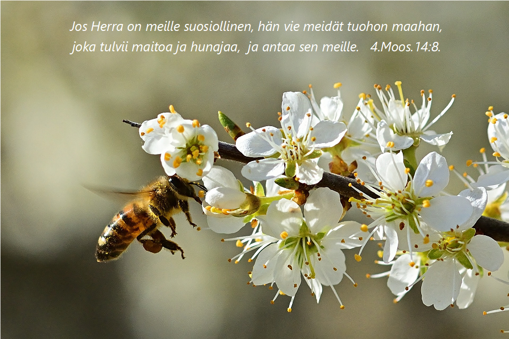 Annetaan rakkautemme näkyä, ahkeroidaan Jumalan elovainiolla, parveillaan ja etsitään hunajaa. Jumala on armossaan antanut meille ravinnoksi maitoa, kalaa, leipää, viiniä ja hunajaa! Kiitetty olkoon Herran nimi, ylistetty Jeesus Kristus! Hän oli olemassa ennen kaikkea muuta, ja hän sitoo kaiken yhteen. Kol.1:17 UT2020.