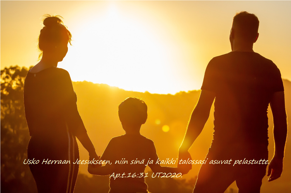 Jumala ei ole kuitenkaan meiltä perheinä ottanut pois siunauksiaan, vaan: Vaimosi on kukoistava viiniköynnös kotisi sydämessä, lapsesi oliivipuiden taimia pöytäsi ympärillä. Ps.128:3 Psalmit 2024. Oli lapsia paljon tai vähän, uskovia perheitä siunataan: Hän vahvistaa porttiesi lukitukset ja siunaa kaupunkisi asukkaita. Ps.147:13 Psalmit 2024. Vanhempina ja isovanhempina meillä on etuoikeus rukoilla jälkeläistemme puolesta. Saamme luottaa, että Herra kuulee eivätkä lapsemme jää siunauksetta. Minulla on tapana rukoilla lastenlasten puolesta siten, että luettelen heidät nimeltä ja pyydän: Varjele heitä aina kaikilta kolhuilta, vahingoilta, tapaturmilta ja onnettomuuksilta, kaikelta pahalta. Myös kaikenlaisilta taudeilta ja suo heidän olla terveitä, reippaita ja iloisia ja anna taivaan enkeleitä olemaan heidän kanssaan joka päivä… Eräs rukous nousee suoraan Raamatusta: Älä koskaan lähetä jälkeläisiäni miekkaan, ruttoon, nälkään tai vankeuteen, ei myöskään pakolaisuuteen. Jeremia ja Hesekiel viljelevät tällaisia sanontoja. Jos joskus niin pahasti kävisi, että jälkeläisiäni joutuisi pakolaisiksi, heille on varattuna Jumalan lupaus: Sinulla on tulevaisuuden toivo: lapsesi palaavat asuinsijoilleen, sanoo Herra. Jer.31:17.