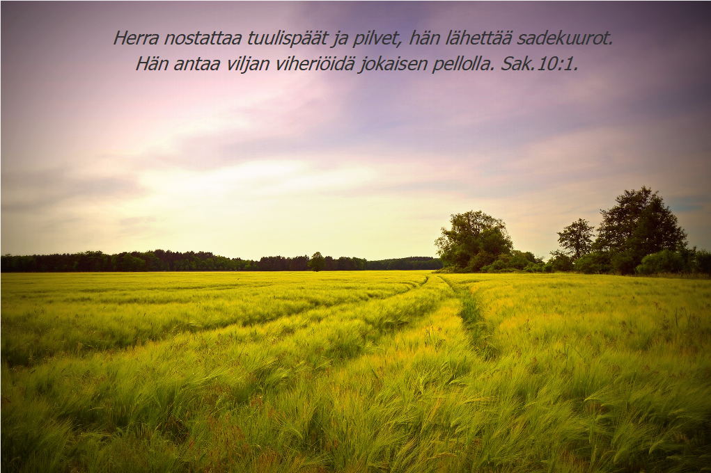 Sinulle, joka olet uskollisesti saarnannut sanaa ja tehnyt hengellistä työtä, Jumalan henki sanoo: Herra on uskollinen uskollisille. Vielä hän ilmestyy, vielä hänen siunauksensa saavuttaa sinunkin työkenttäsi. Sinä saat nähdä, kuinka hedelmä kypsyy, kuinka vilja lainehtii sinunkin sarkasi päästä päähän. Saat nähdä, kuinka hengen sateet virvoittavat kuivan maan ja kuinka Jumalan armo pelastaa ihmisiä. Sinä saat nähdä, että Jumala täyttää janoiset sielut hengellään ja armolahjat alkavat toimia. Ole siunattu Jeesuksen nimessä! Ylistä Herraa, joka palkitsee sinun vaivannäkösi. Sinun ei tarvitse enää kauan odottaa.