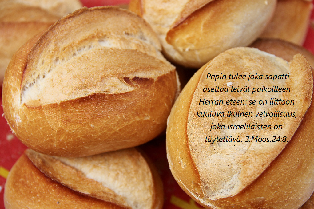 Olennaista on tämä uuden liiton papillekin sopiva sanan ja rukouksen harrastus Pyhän Hengen läsnäolossa. Tehdään sitä. Huomionarvoista on, että Jumala sanoo Aaronille ohjeeksi: Leivät kuuluvat Aaronille ja hänen jälkeläisilleen. Heidän on syötävä ne pyhässä paikassa, sillä ne ovat erityisen pyhiä. Ne on säädetty heidän ikuiseksi osuudekseen Herralle omistetuista tuliuhreista. 3.Moos.24:9.