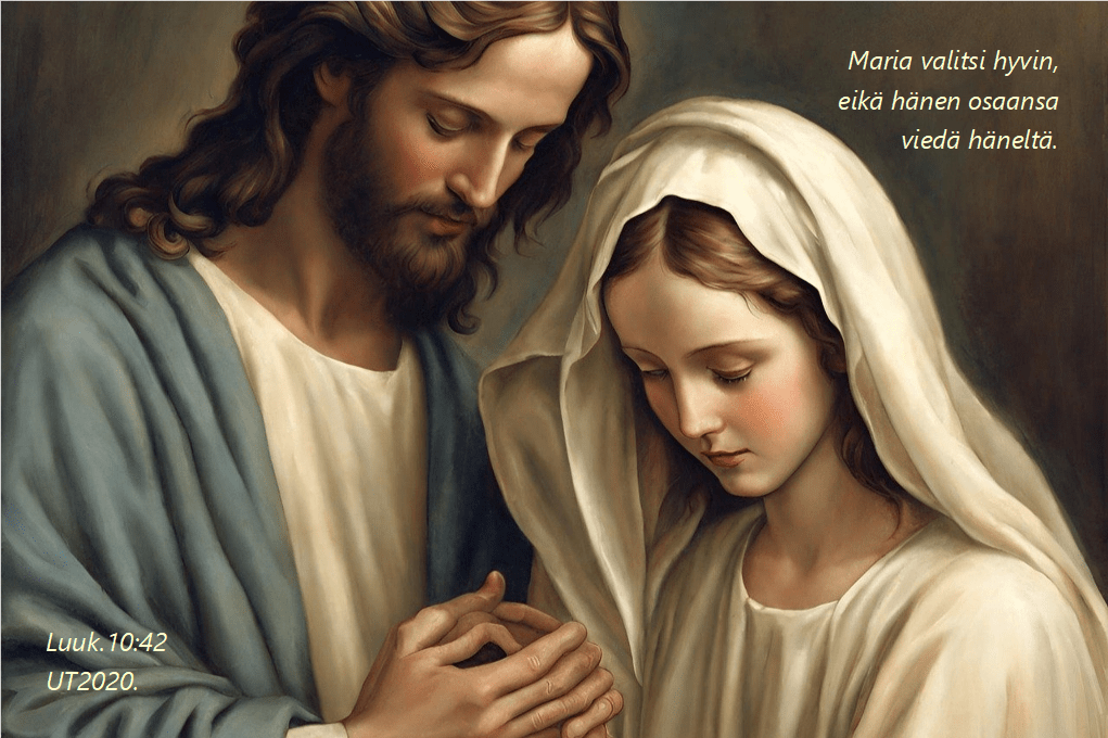 Martta sen sijaan hääräsi palvelemassa vieraitaan. Viimein hän pysähtyi ja kysyi: »Herra, eikö sinua haittaa, että siskoni jätti minut yksin palvelemaan sinua? Käske hänen auttaa.» Jeesus kuitenkin vastasi: »Martta, Martta, sinä huolehdit ja otat paineita monista asioista. Vain yksi asia on tarpeen. Maria valitsi hyvin, eikä hänen osaansa viedä häneltä.» Luuk.10:40-42 UT2020.