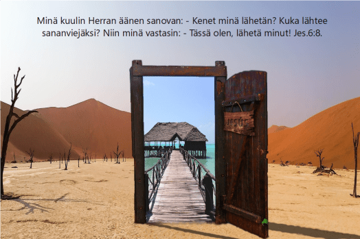 Mikä ovi sinulta onkaan sulkeutunut? Mikä työpaikka sinulta meni sivu suun? Mikä luottamustoimi seurakunnassa oli haave vain? Sinä sen itse parhaiten tiedät, mutta Jumalan henki puhuu selvää kieltä: se ovi sulkeutui, jotta jokin parempi ovi voisi avautua. Jos Jeesus ei ole sallinut sinun ryhtyä haluamaasi työhön, hän avaa sinulle toisen työn, joka on paljon siunatumpi. Sinun pitää nyt olla määrätietoinen, elää uskon hengessä, lopettaa murjottaminen, kestää vastoinkäymisesi ja venyttää kestokykyäsi. Aikanaan saat nähdä, mihin Jumala sinua johdattaa, mikä näköala sinulle avautuu, mitkä lahjat olet saanut, mikä työ on sinua varten. Saat nähdä kutsumuksen, jossa on sinun nimesi, näyn joka on räätälöity sinulle. Sinä saat voitelun, jota kukaan muu ei voinut saada.