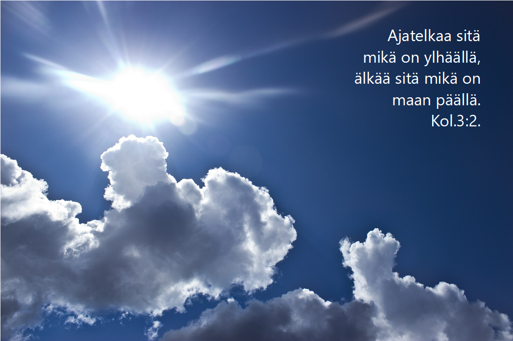Minä luotan siihen, että Jumala, joka on teissä aloittanut hyvän työnsä, myös saattaa sen päätökseen Kristuksen Jeesuksen päivään mennessä. Fil.1:6.